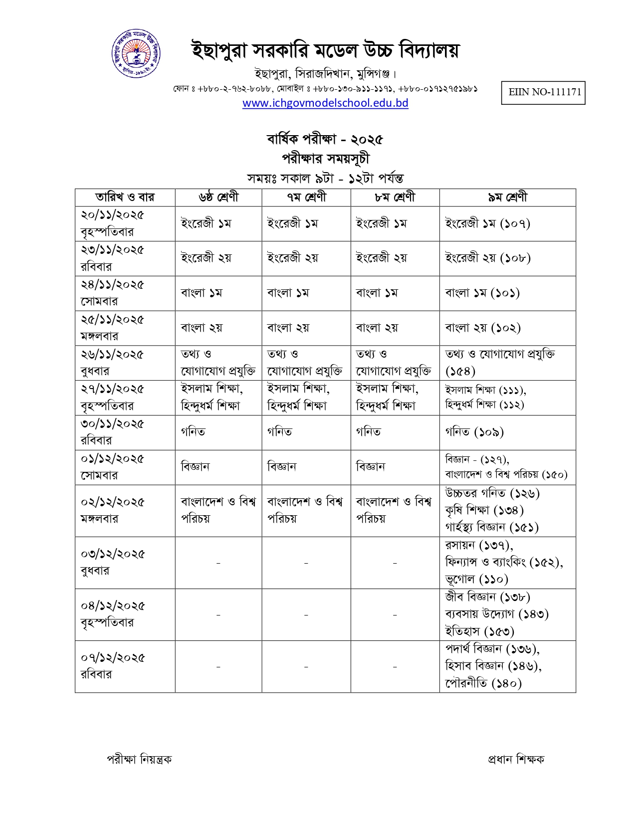 বার্ষিক পরীক্ষার সময়সুচী - ২০২৫