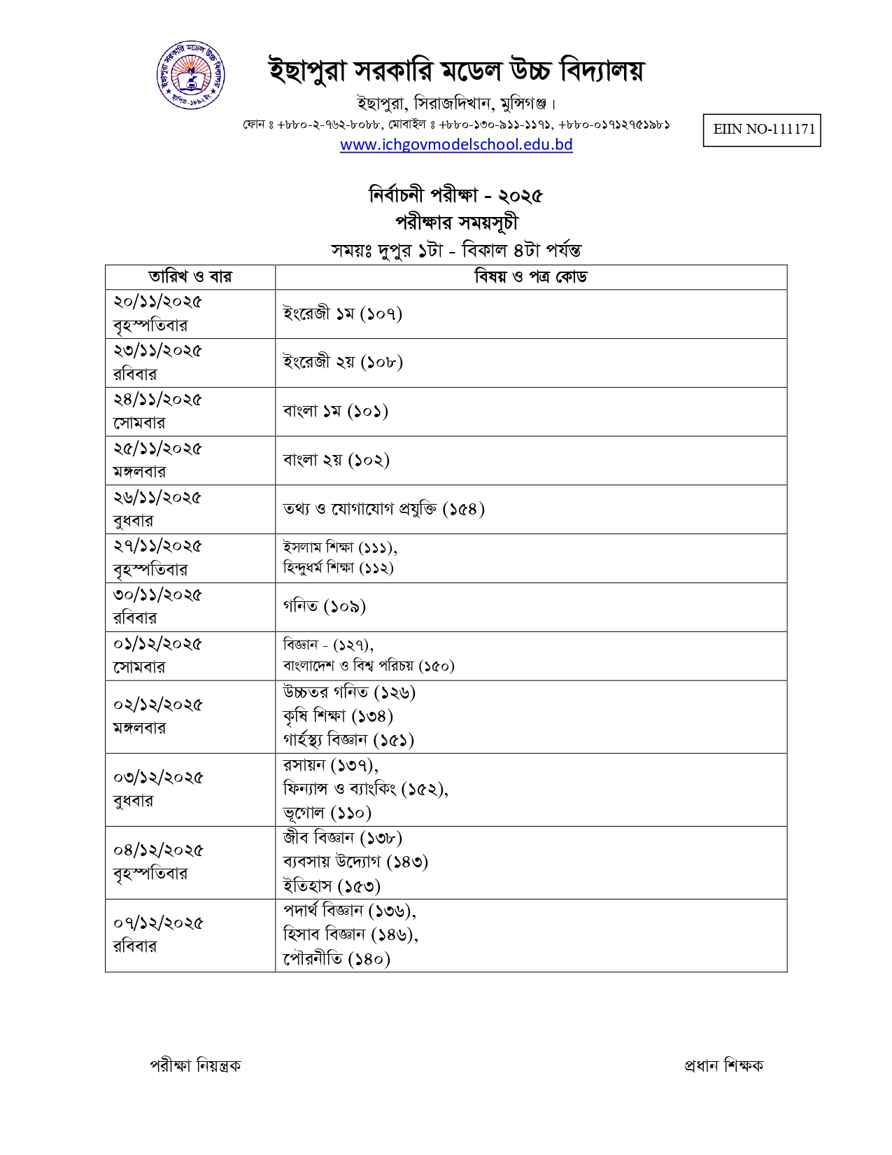 নির্বাচনী পরীক্ষার সময়সুচী - ২০২৫